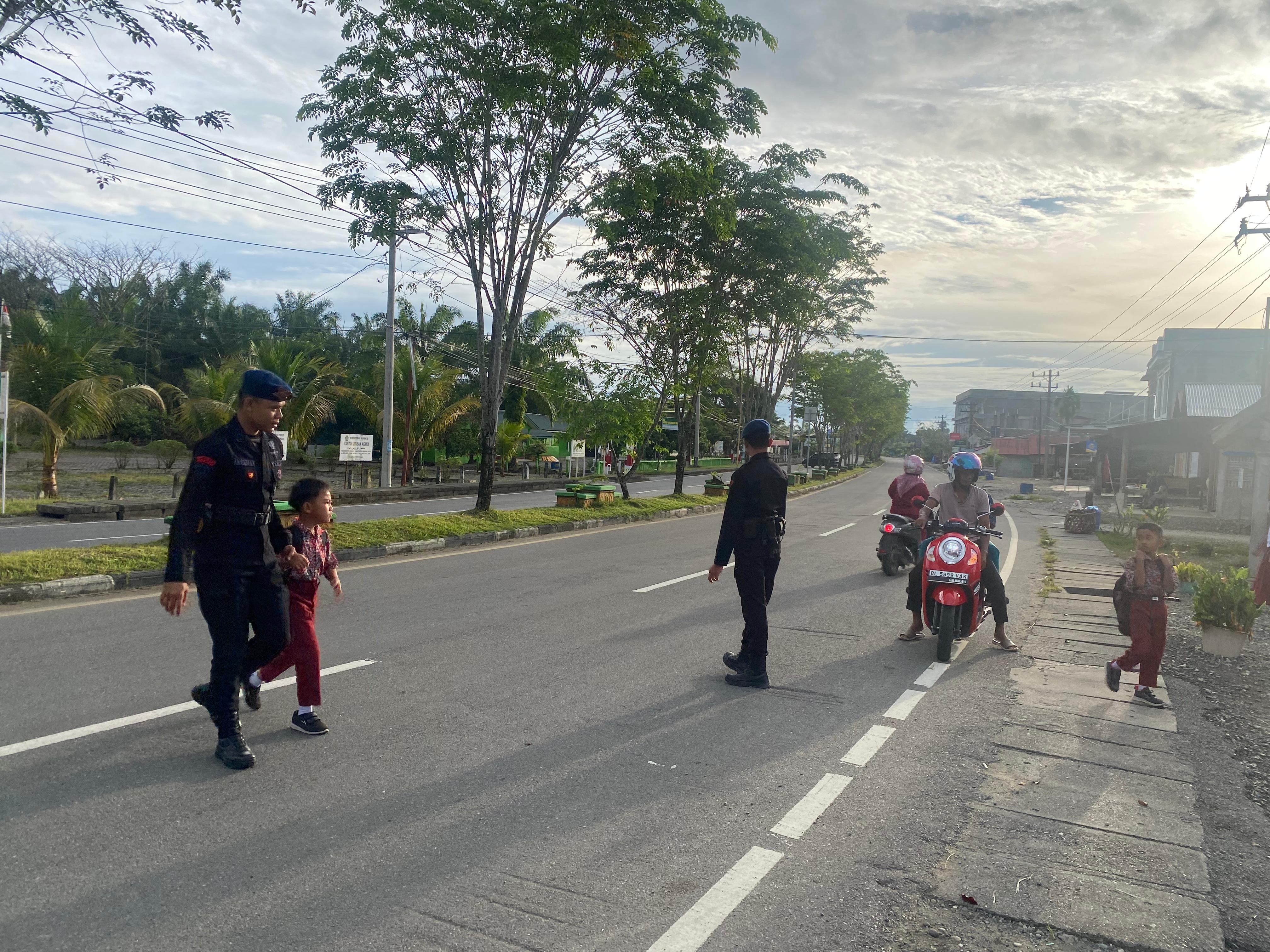 Brimob Batalyon C Pelopor Bantu Anak Sekolah Menyeberang di Nagan Raya