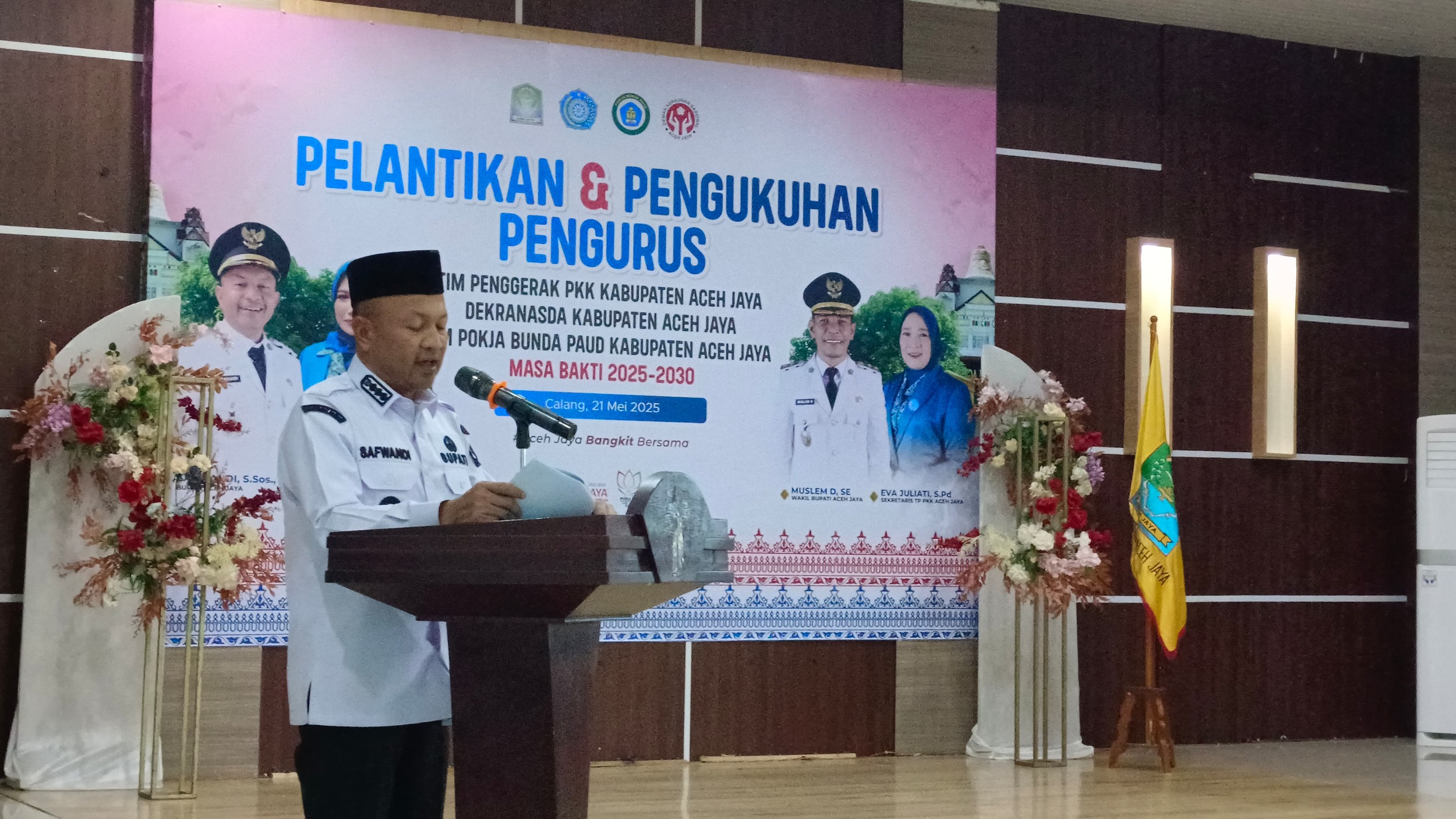 CALANG - Bupati Aceh Jaya, Safwandi, S.Sos., melantik dan mengukuhkan Pengurus Tim Penggerak Pemberdayaan Kesejahteraan Keluarga (TP PKK), Pengurus Dewan Kerajinan Nasional Daerah (Dekranasda), serta Tim Kelompok Kerja (Pokja) Bunda PAUD Kabupaten Aceh Jaya masa bakti 2025-2030 di Aula DPMPKB Aceh Jaya ini pada rabu, 21 mei 2025.