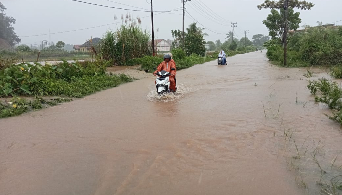 Calang - Hujan dengan intensitas tinggi yang melanda kabupaten Aceh Jaya pada Senin malam (14/10/2024) menyebabkan badan jalan lintas desa di wilayah tersebut tergenang banjir.