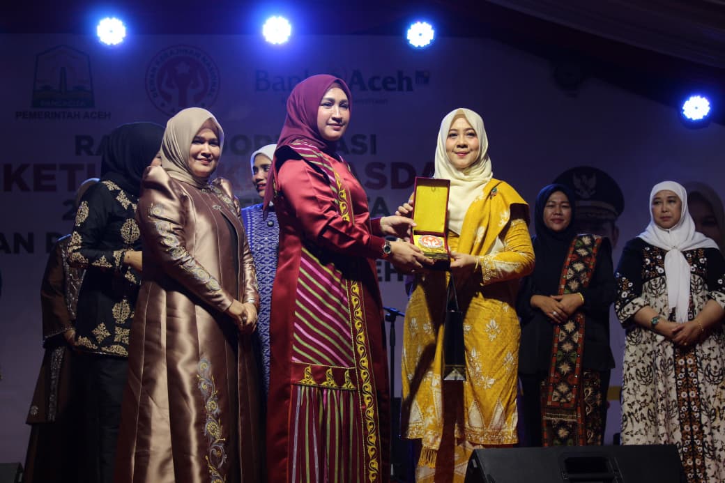 Penghargaan tersebut diserahkan langsung oleh Ketua Dekranasda Aceh, Ny. Marlina Muzakir, kepada Ny. Cut Inda TR. Keumangan dalam acara penutupan Rapat Koordinasi Ketua Dekranasda 23 Kabupaten/Kota dan Pameran Kriya Unggulan Dekranasda se-Aceh, yang berlangsung di UMKM Center Bank Aceh, Lampineung, Banda Aceh, pada Minggu (9/11/2025) malam.