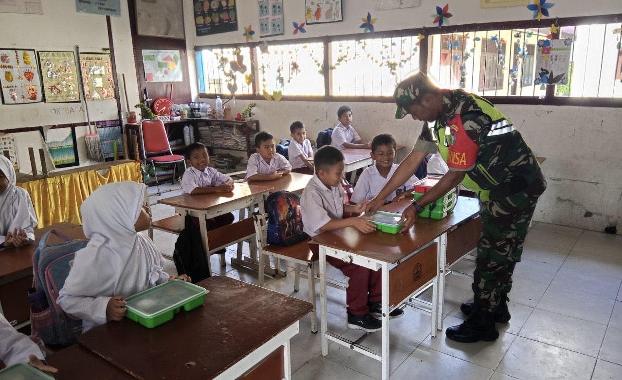 Suka Makmue - Babinsa Koramil 02/Seunagan Sertu Tri Romadona melakukan pendampingan kepada para siswa dalam program Makan Bergizi Gratis di SDN Parom Kecamatan Seunagan, Kabupaten Nagan Raya, Senin (24/02/2025)