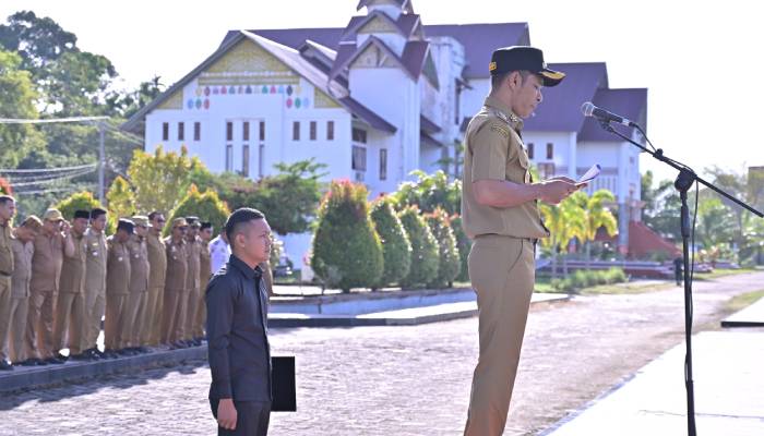 CALANG - Wakil Bupati Aceh Jaya, Muslem D, memimpin apel perdana bersama seluruh Aparatur Sipil Negara (ASN) di lingkungan Pemerintah Kabupaten Aceh Jaya, Senin (24/2/2025).